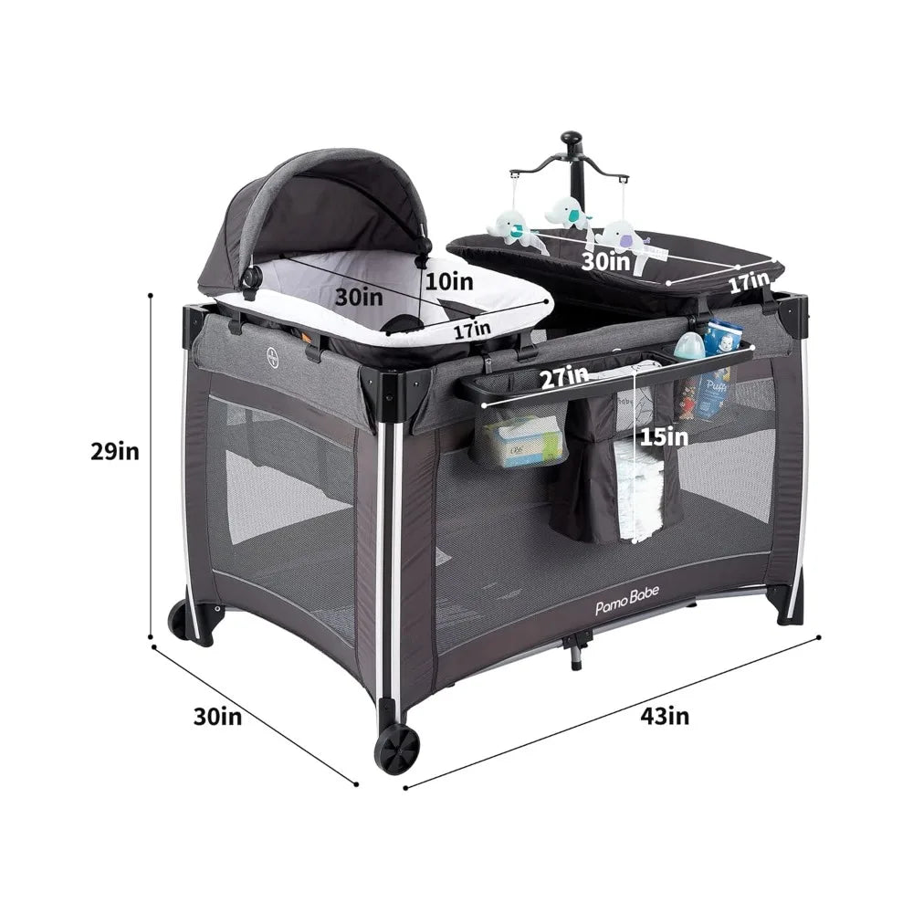 4 in 1 Portable Baby Crib Deluxe Nursery Center, Foldable Travel Playard with Bassinet, Mattress, Changing Table for Newborn,