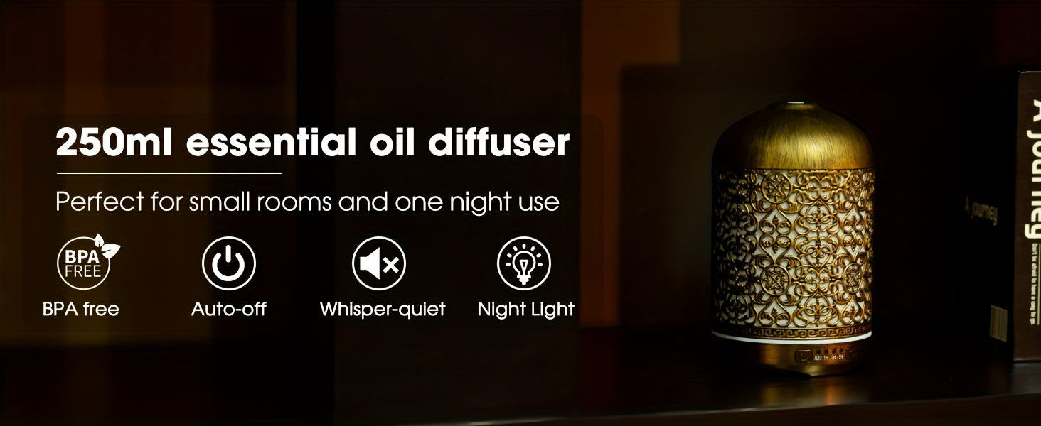 8.45oz Essential Oil Aromatherapy Diffuser for Home Bedroom Office Metal Hollow Decorative Room Ultrasonic Air Scent Mist Aroma Diffuser