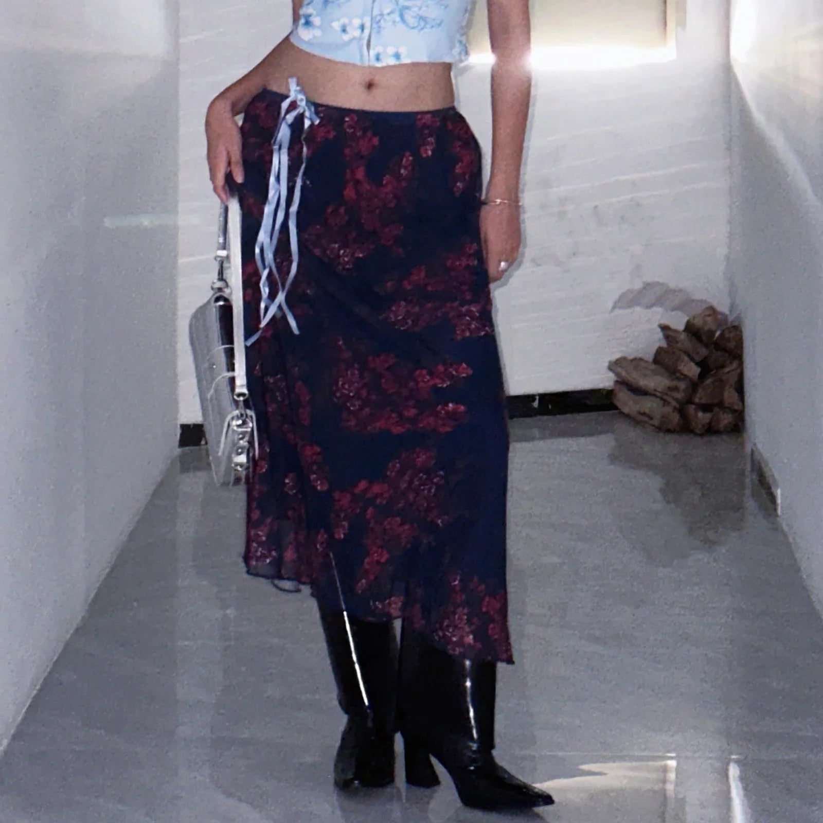 Combhasaki Women's Y2K Retro Vintage Floral Printed High Waist Ruffled Elegant Elastic Waist Long Skirts Street Style Bottoms