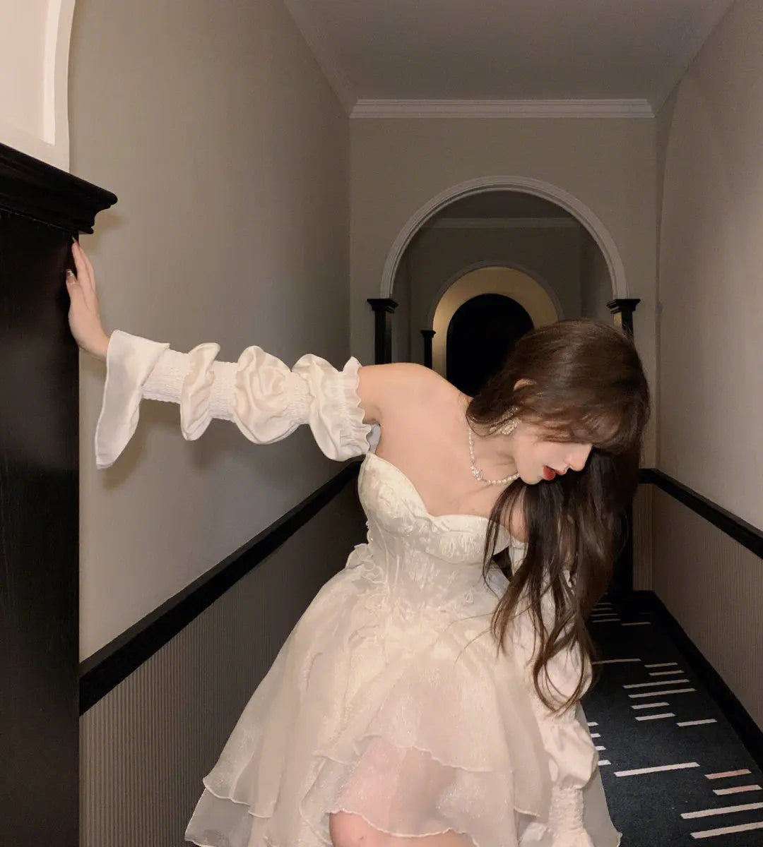 Elegant Ruffles Chic Fairy Dress Women White Sweet Korean Style Princess Dress Female 2025 Summer Slash Neck Casual Party Dress