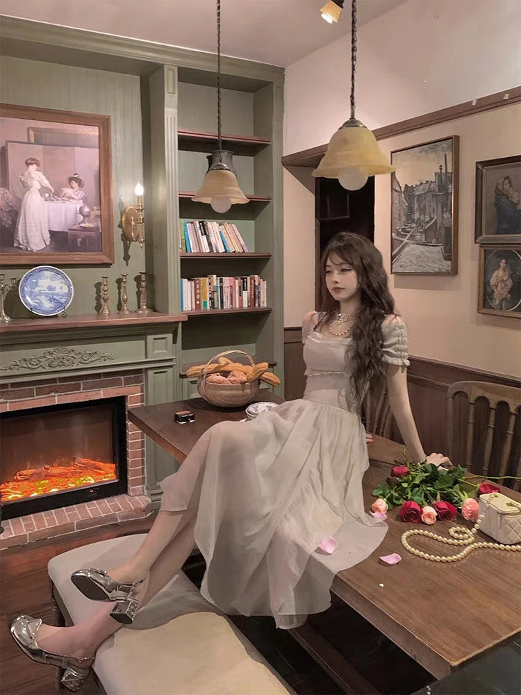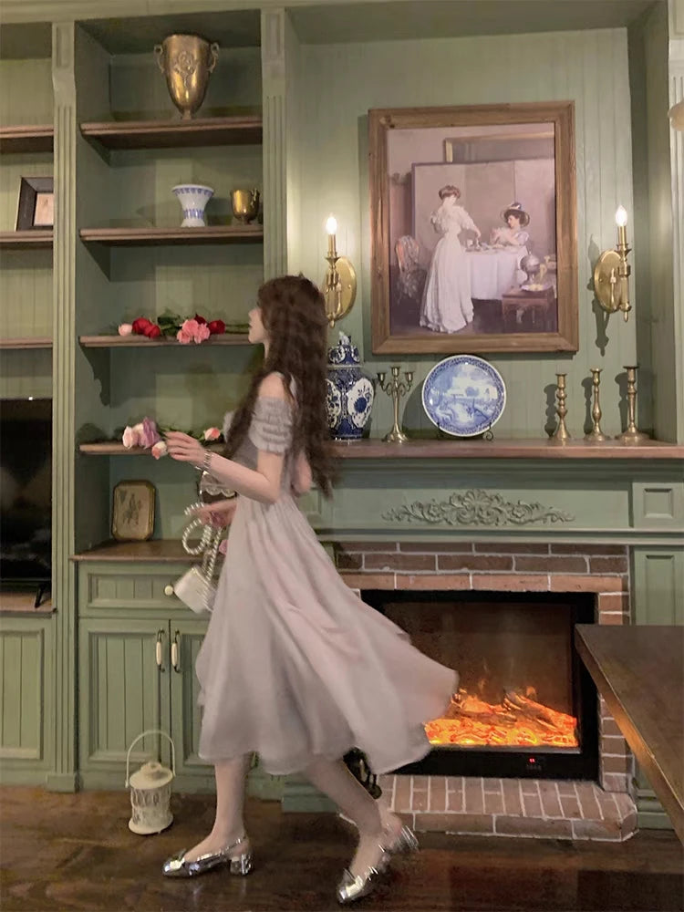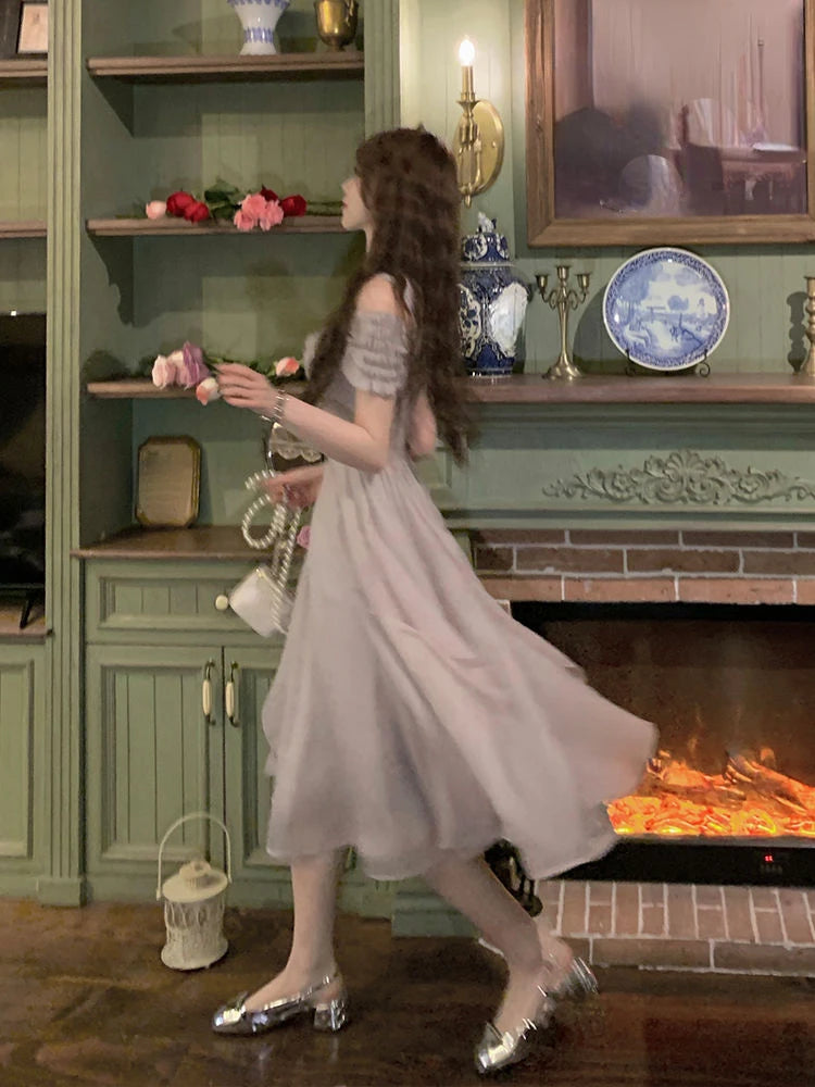 Korean Casual Midi Dress for Women 2025 New Summer Fashion Elegant Off The Shoulder Folds Ruffle Female Clothes Birthday Dress