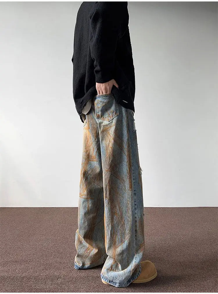 Men's trousers summer thin tie-dyed ripped jeans men's loose straight washed distressed high street American men's trousers
