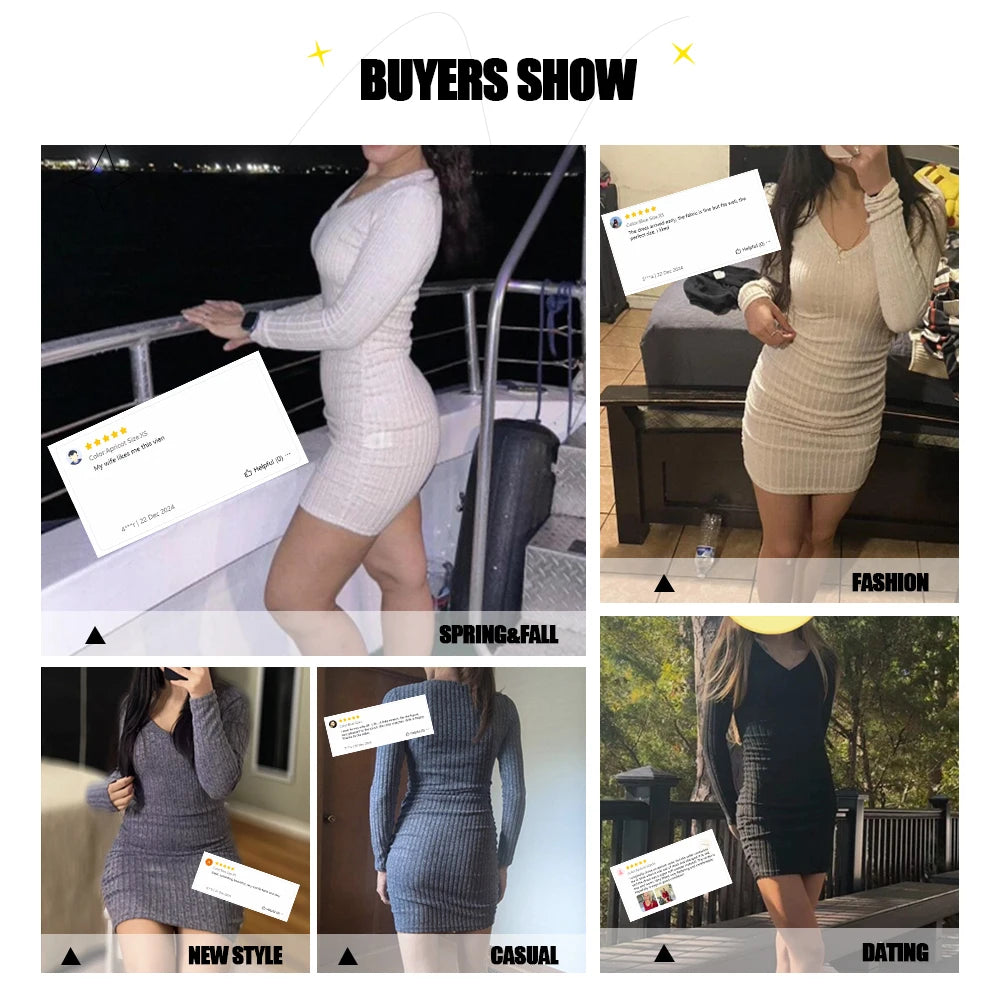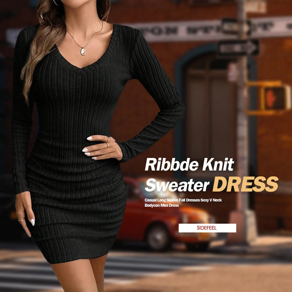 Mia Muse Women's Dresses Fall Winter Ribbed Knitted Slim Plain Sexy V-Neck Bodysuit Mini Casual Long Sleeve Short Dresses