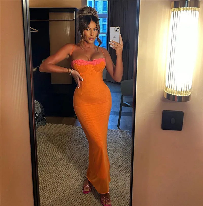 Mozision Lace Spaghetti Strap Bodycon Maxi Dress Women Robe New Patchwork Strapless Sleeveless Backless Sexy Club Party Dress