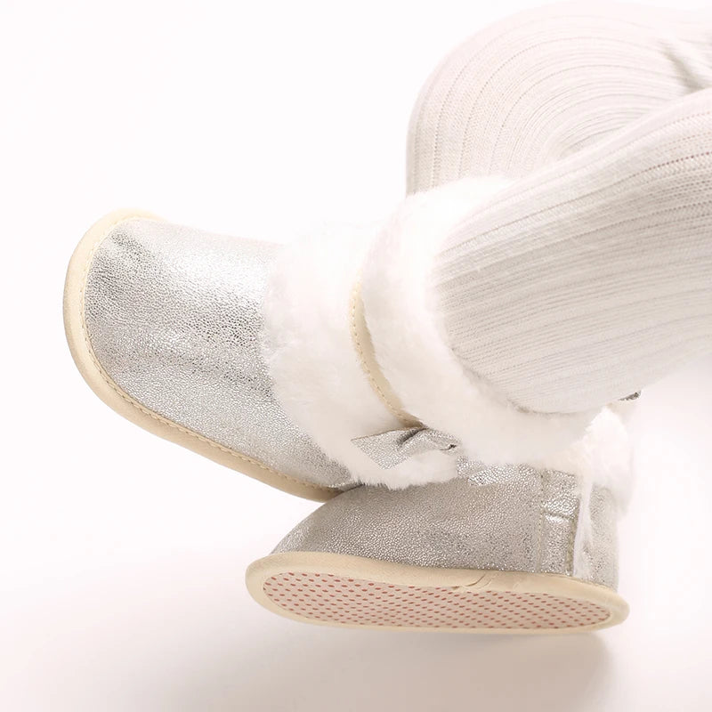Suefunskry Newborn Baby Girl Winter Warm Plush Boots Shiny Flats with Cute Bows Casual Walking Shoes for Toddler Infant