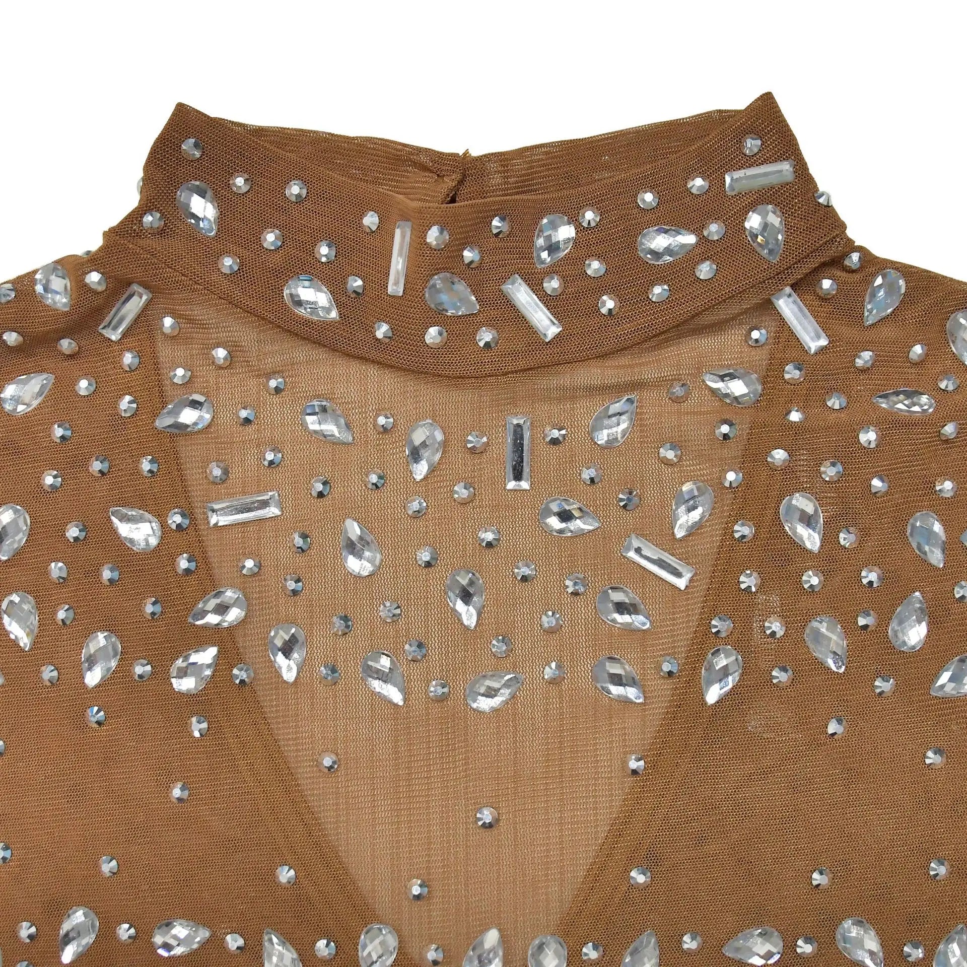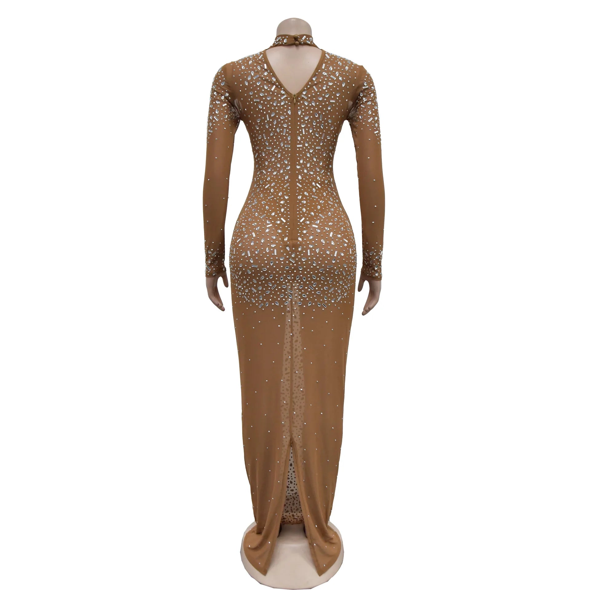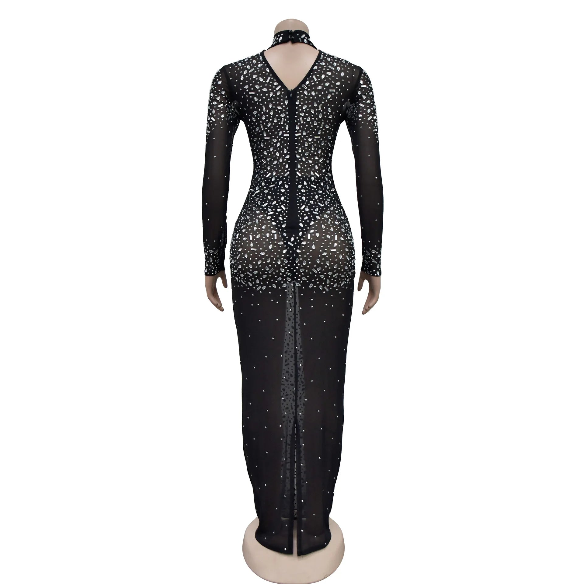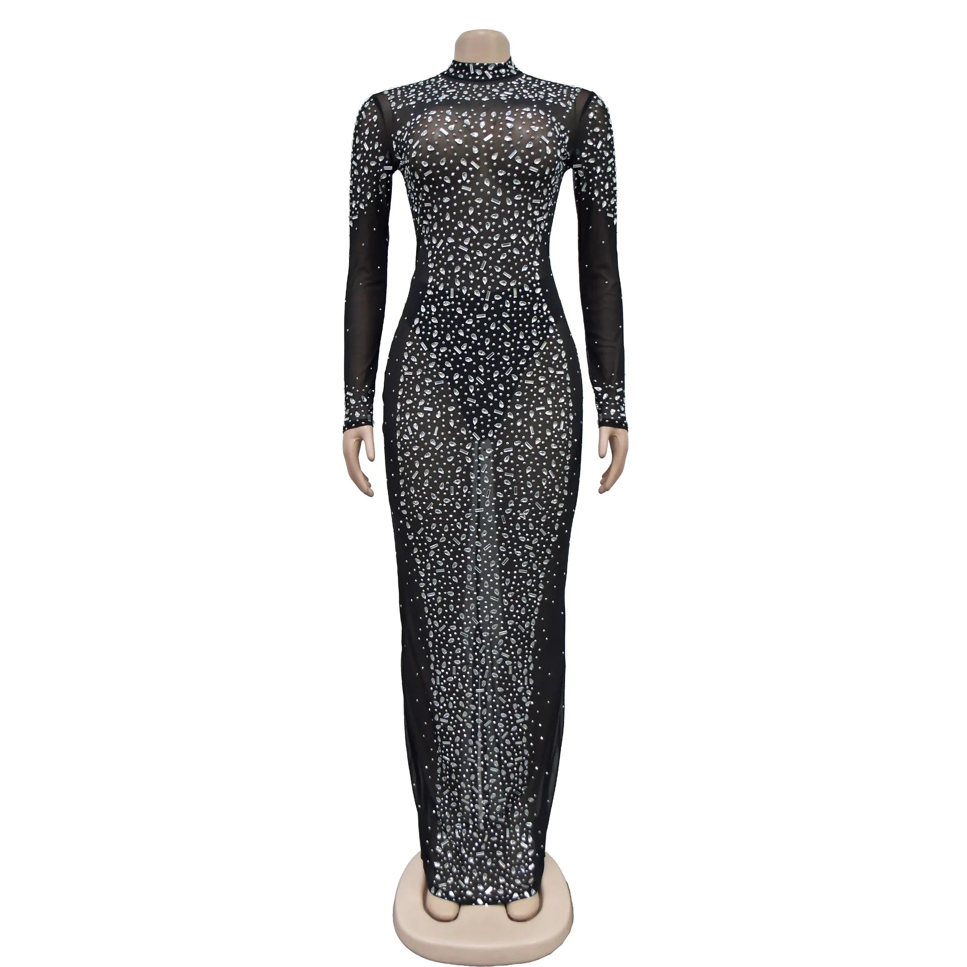 Women Sexy See Through Sheer Mesh Rhinestone Décor Long Sleeve Maxi Party Dress