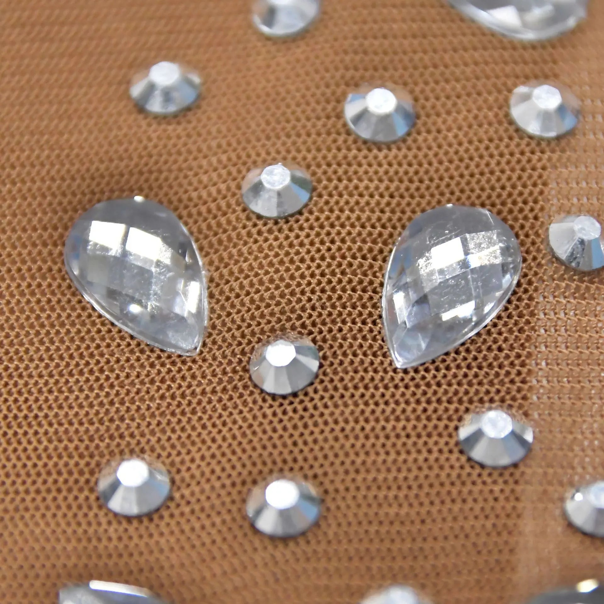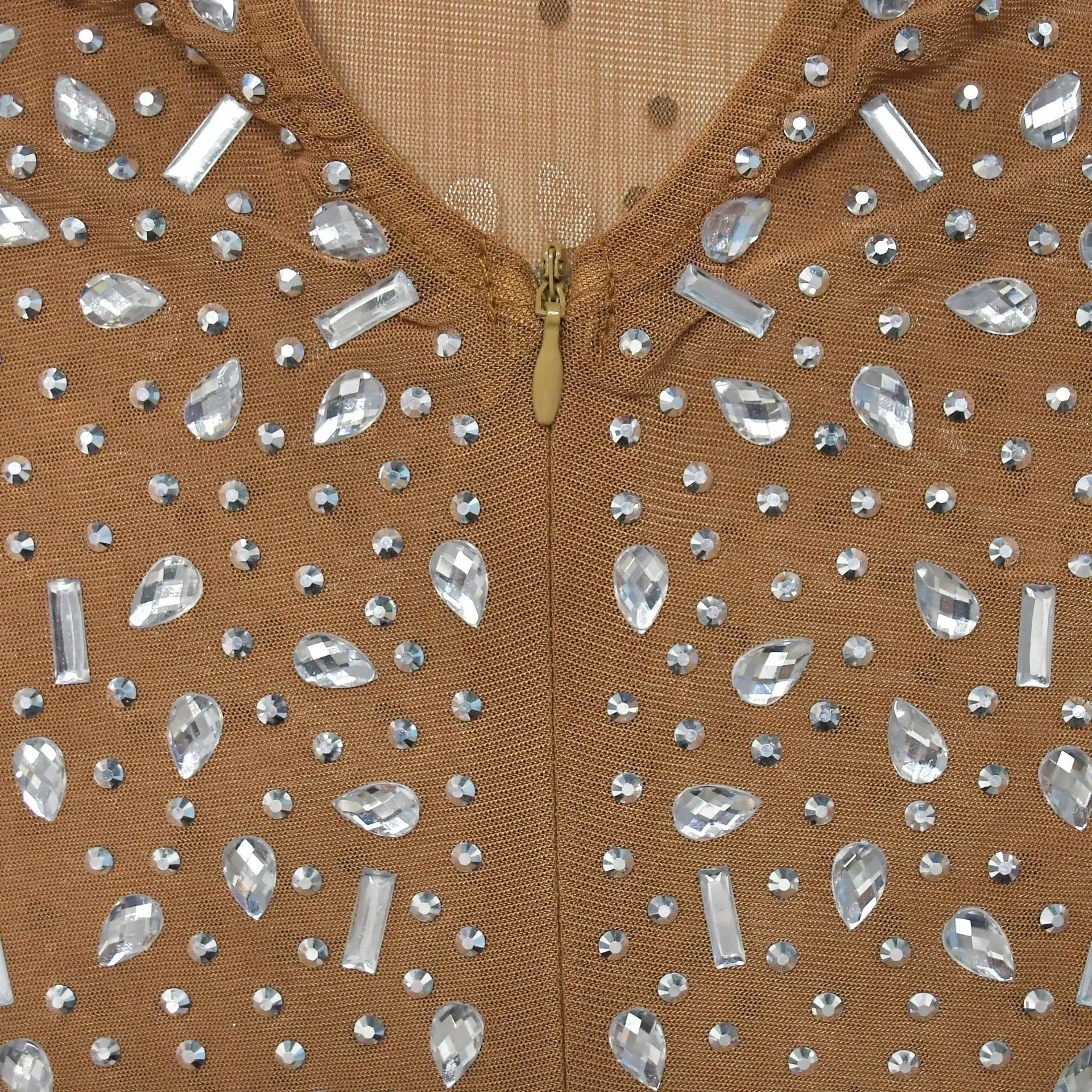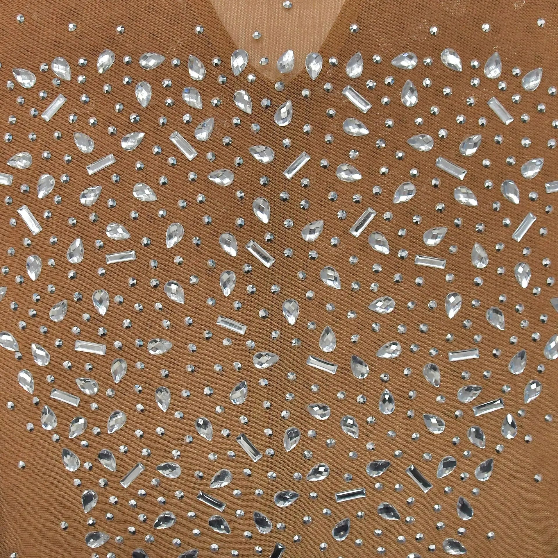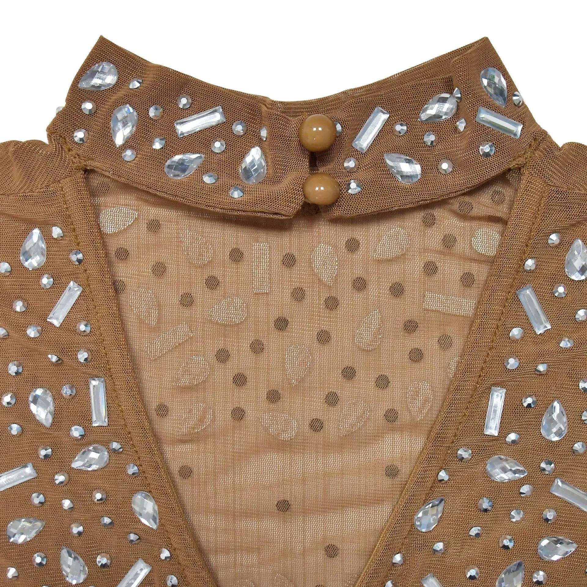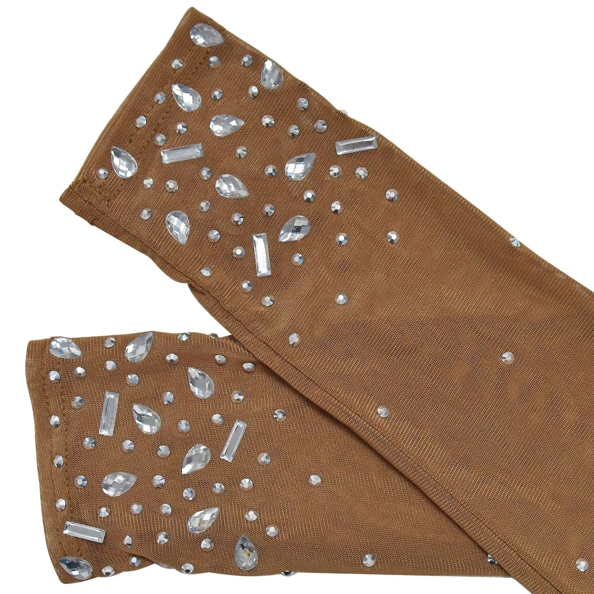 Women Sexy See Through Sheer Mesh Rhinestone Décor Long Sleeve Maxi Party Dress